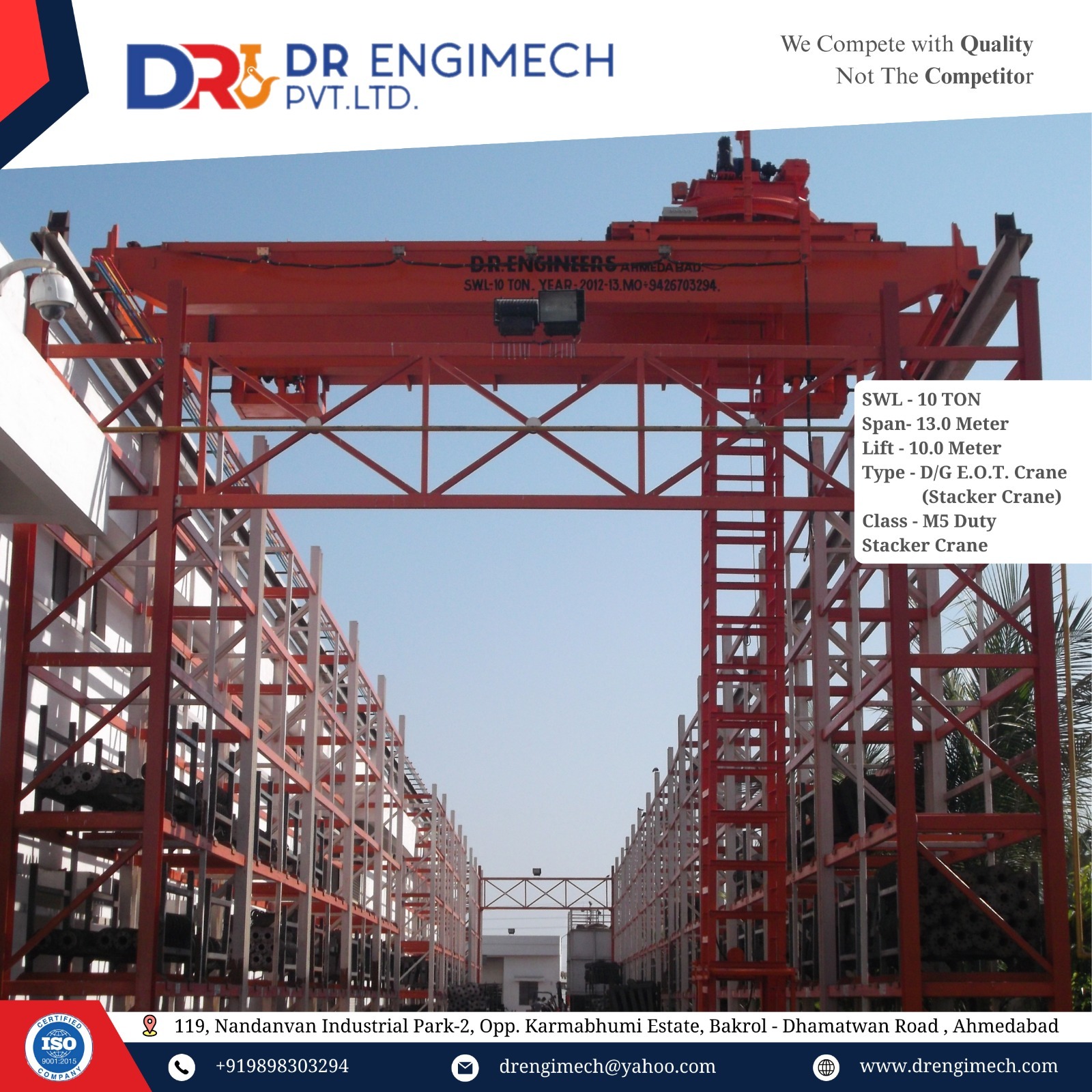 D.R. Engimech Pvt. Ltd. offers custom-engineered solutions for stacker cranes based on lifting height, span, duty class, load type, control mode (pendant, radio remote, or cabin), and facility layout. Each crane undergoes stringent quality checks and load testing in compliance with IS standards and international quality norms.