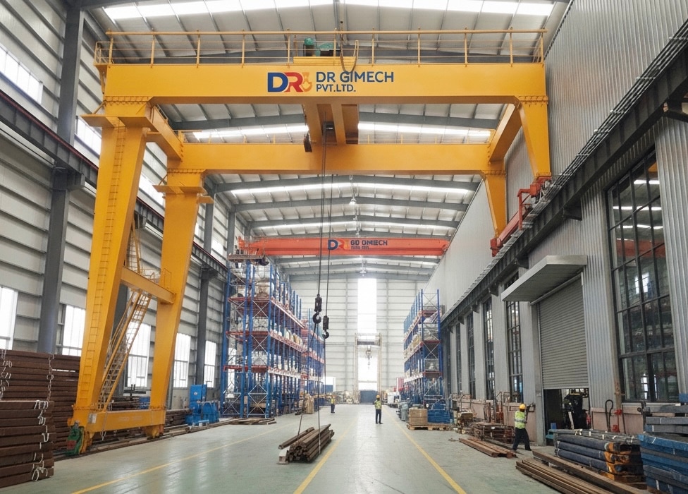 Double Girder Semi-Gantry Crane A Double Girder Semi-Gantry Crane is a heavy-duty overhead lifting system designed with two parallel girders that provide superior strength, stability, and increased lifting height compared to single girder models. Supported by end carriages on both sides, it ensures smooth, safe, and precise load handling across large industrial facilities. These cranes are ideal for manufacturing plants, steel industries, powerhouses, heavy engineering workshops, and large warehouses where high lifting capacities and long spans are required. The robust construction and advanced design allow for high-speed operations, improved hook approach, and maximum utilization of workspace. Each crane is engineered and tested as per IS 3177, IS 807, standards, ensuring durability, reliability, and operator safety. | Parameter | Details | | Capacity | Up to 150 Ton | | Span | Up To - 80 Meters | | Lift Height (HOL) | Up To - 100 Meters | | Duty Cycle | M1 to M8 as per IS 3177 /IS 807 | | Optional Features | Radio Remote Control ,Safety Limit Switches |